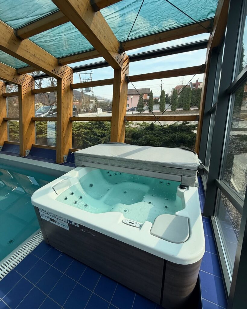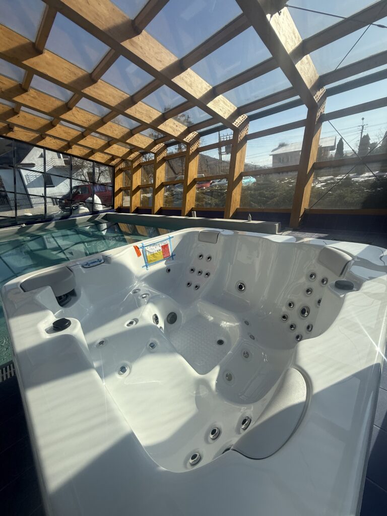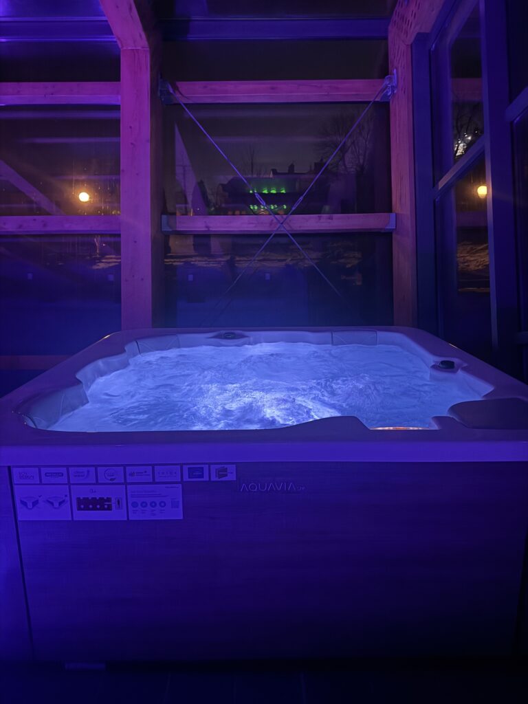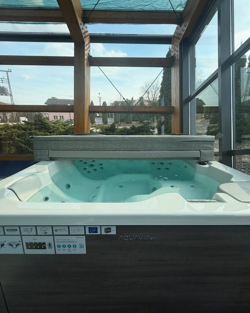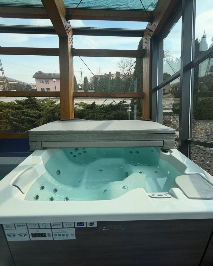 Wymiary jacuzzi 198x198x74cm, 5 miejsc, 42 dysze, oświetlenie podwodne z koloroterpią LED, ozonowanie wody.
